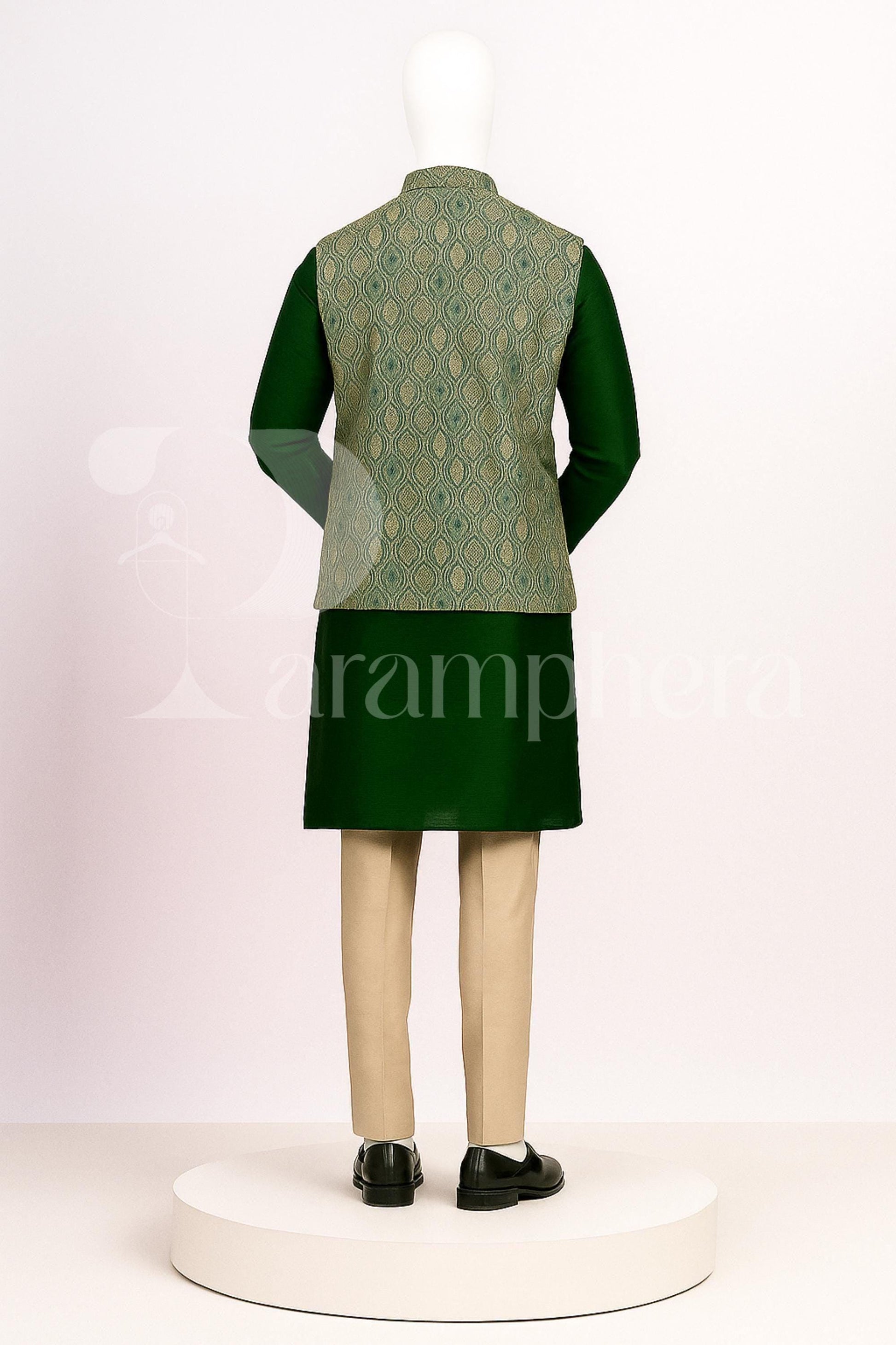Handmade Green Kurta Pant Set with Brocade Nehru Jacket | Indian Wedding Outfit