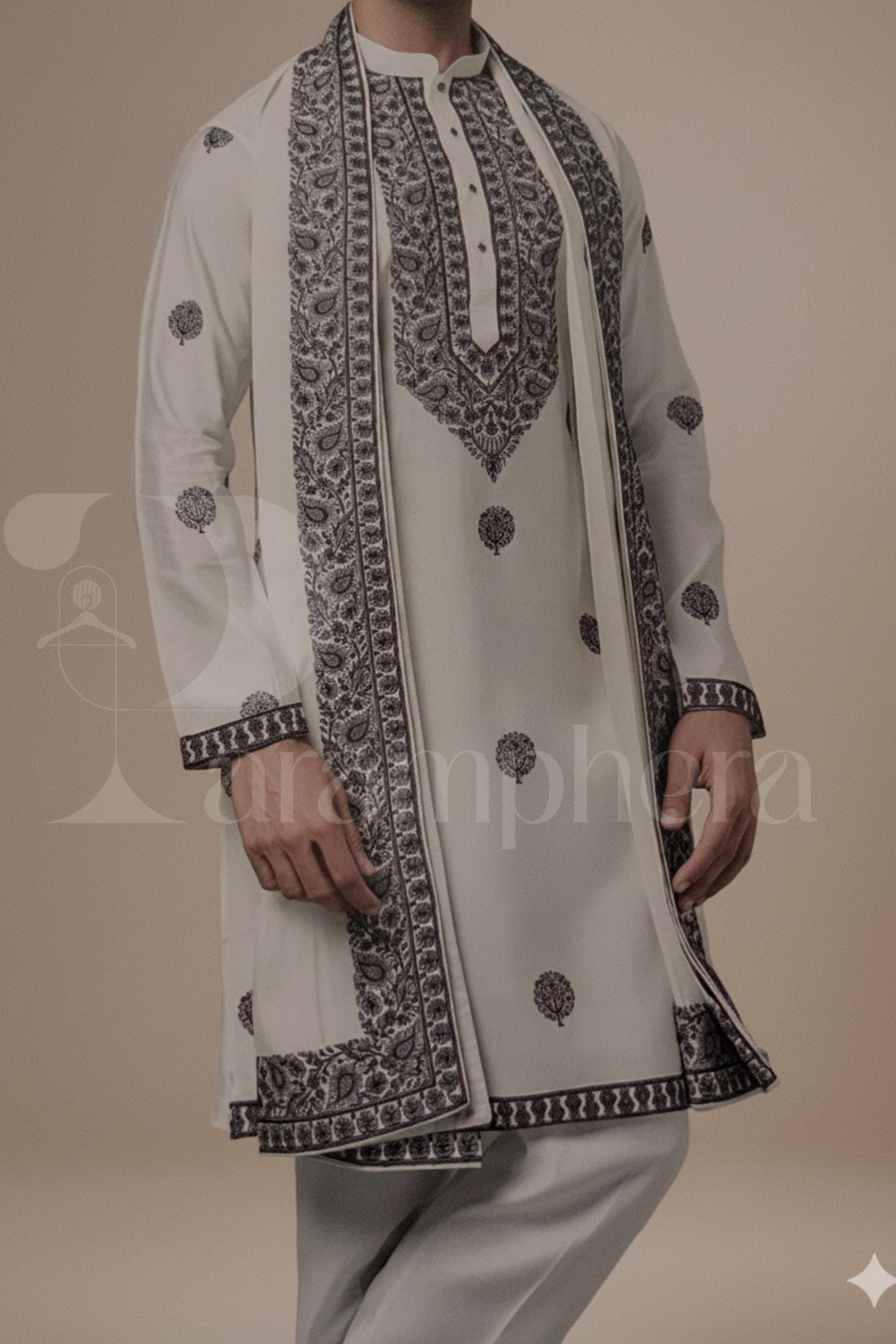 Step into timeless elegance with this ivory embroidered men’s kurta set, crafted for weddings, receptions, festive occasions, and cultural celebrations worldwide. This refined outfit combines a tailored kurta, slim-fit trousers, and a beautifully detailed embroidered border for a regal look.