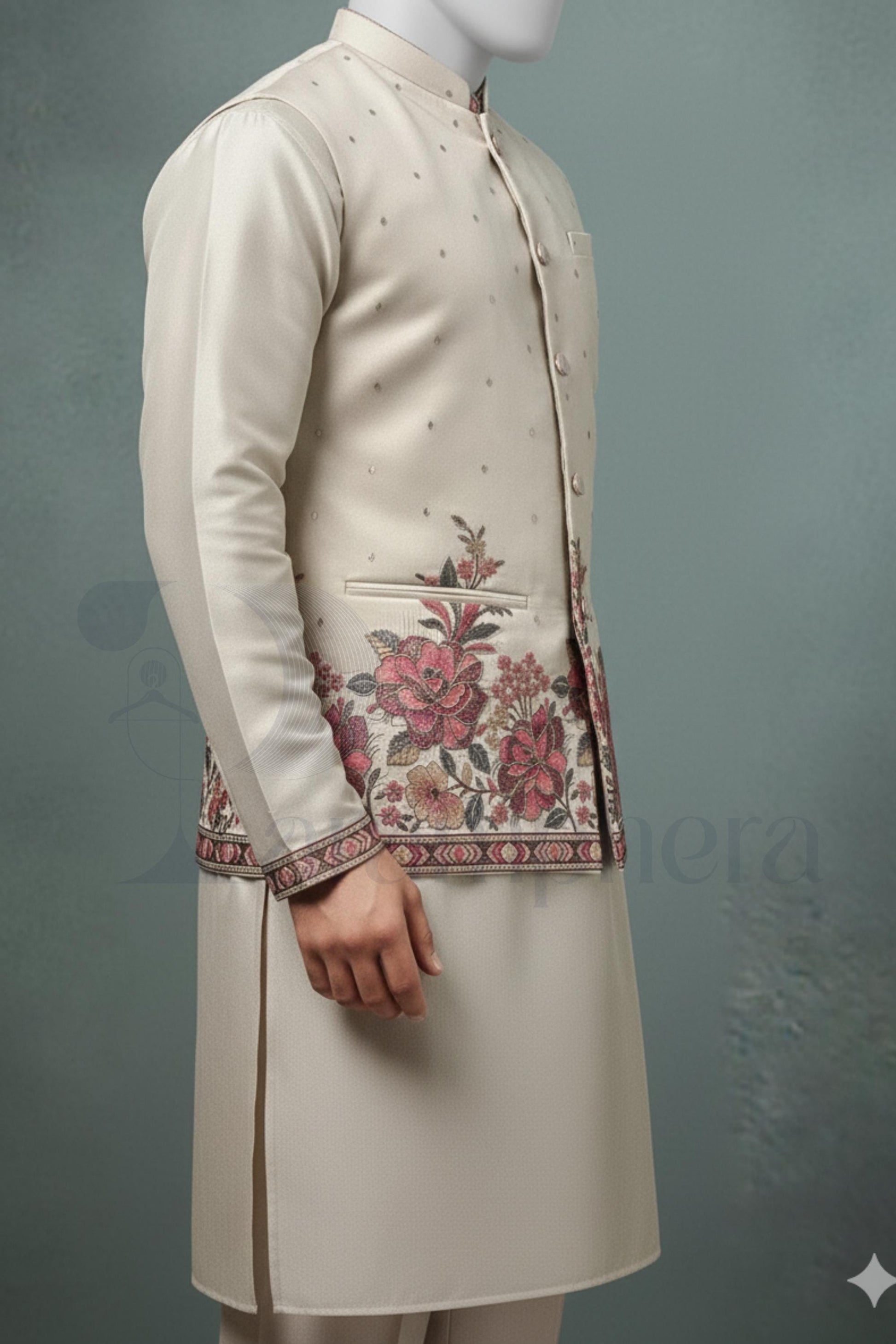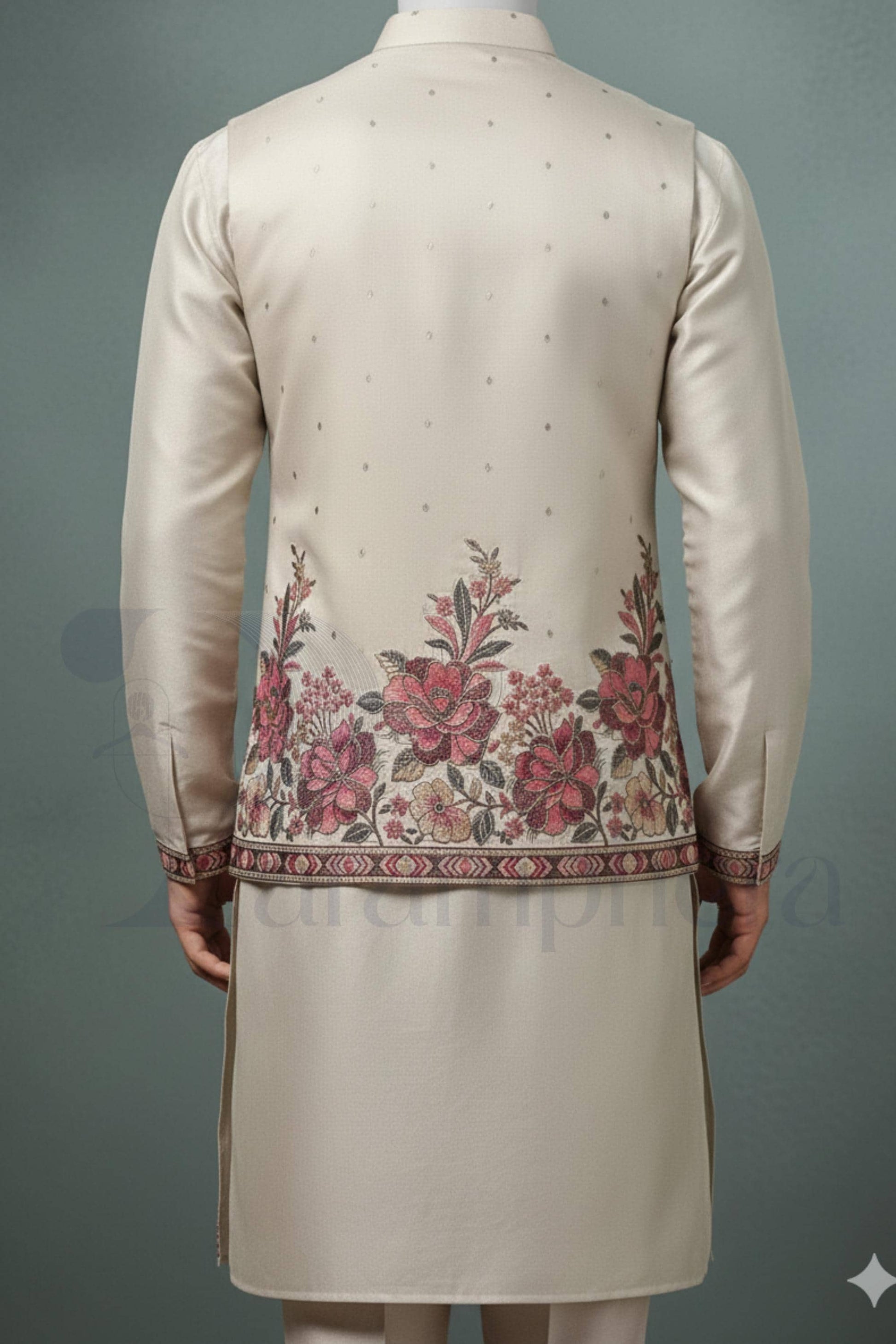 This listing is for a complete set: ivory Nehru-style jacket (mandarin collar) with detailed floral embroidery at the hem and cuffs, matched with a long kurta and straight pants. The jacket features covered buttons, welt pockets, and a tailored cut that layers well over a kurta. Fabric: premium silk-blend (breathable lining). Color: Ivory / Off-white with muted pink & gold floral embroidery.