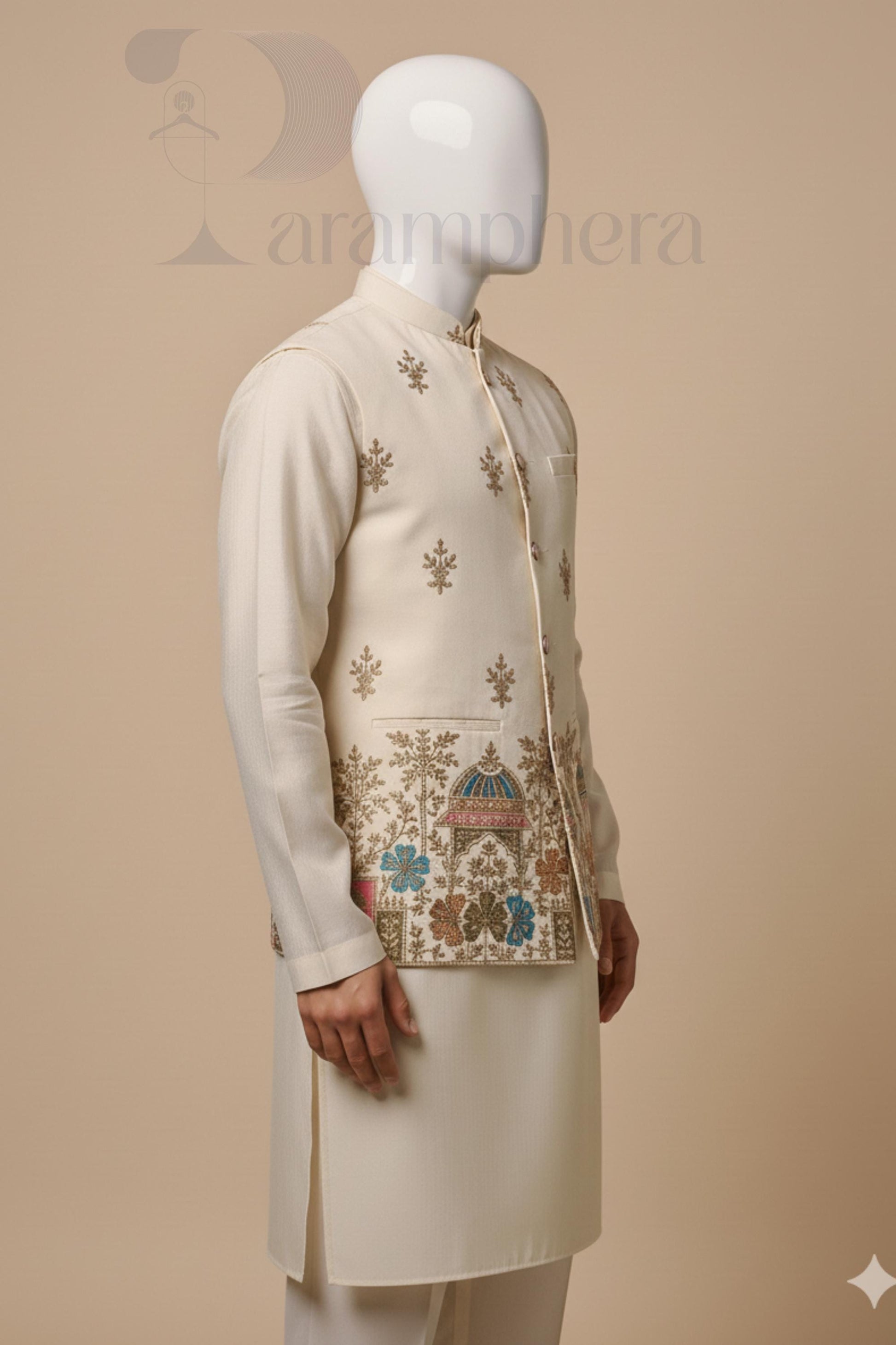 Ivory Nehru jacket with artisan hand embroidery and colorful dome & floral motifs — a standout groom jacket for destination weddings, engagement events, and formal celebrations. Ready-made and Made-to-Measure options available.