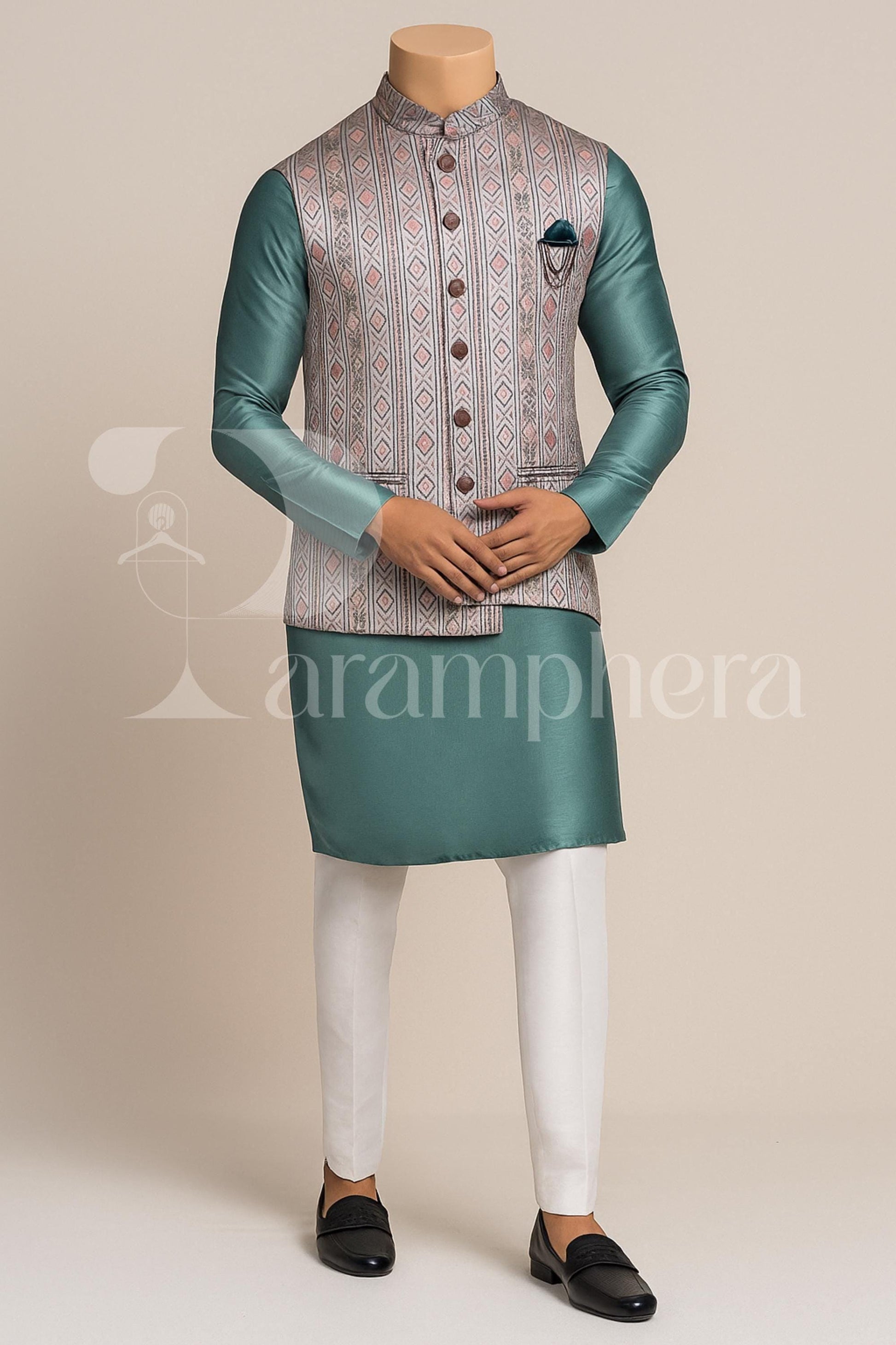 Mint Green Silk Kurta Pajama Set with Brocade Nehru Jacket: Indian Wedding Outfit