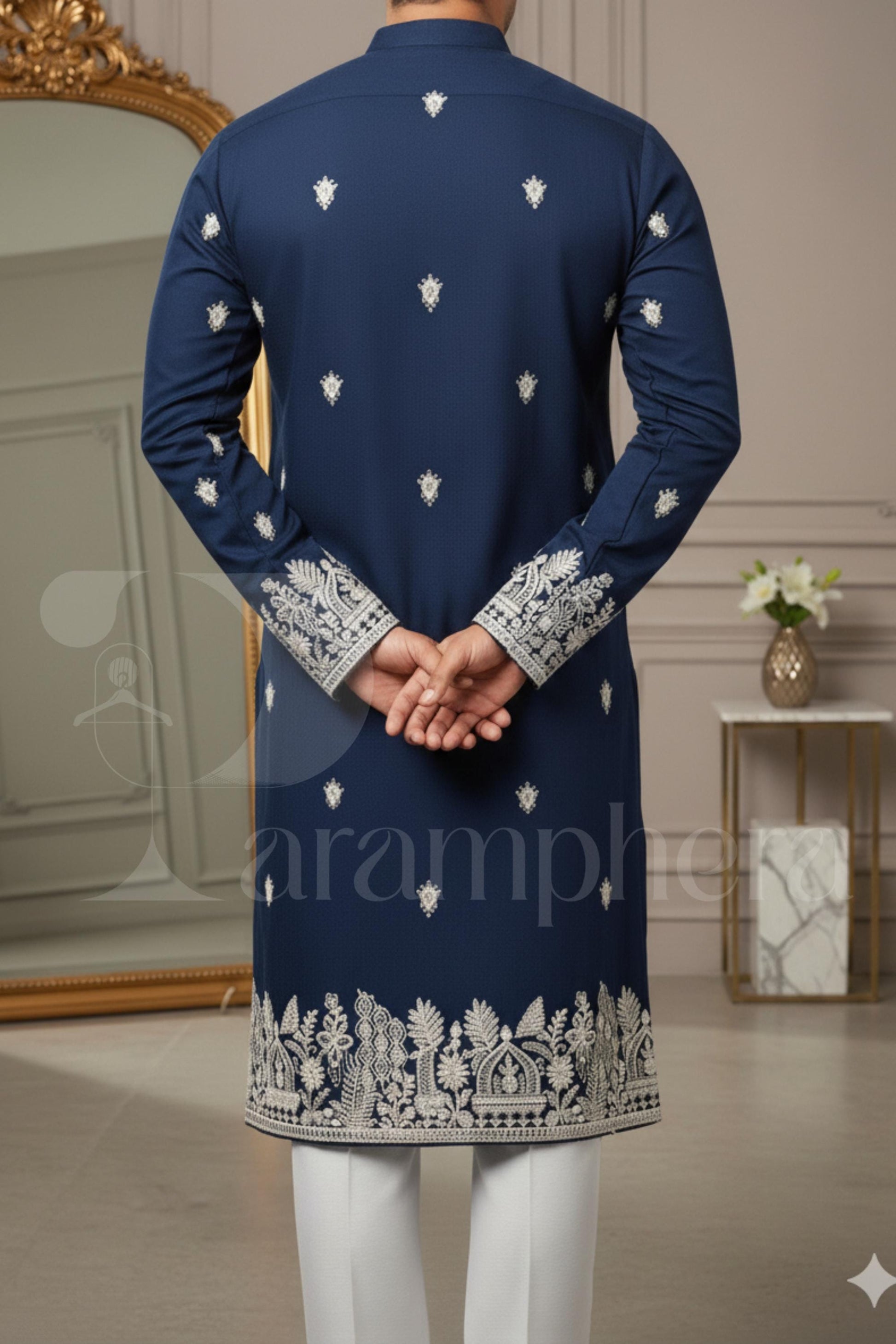 Luxury navy embroidered men’s kurta crafted in premium breathable cotton — elegant for weddings, Eid, and destination events. Modern slim fit with traditional embroidery border.