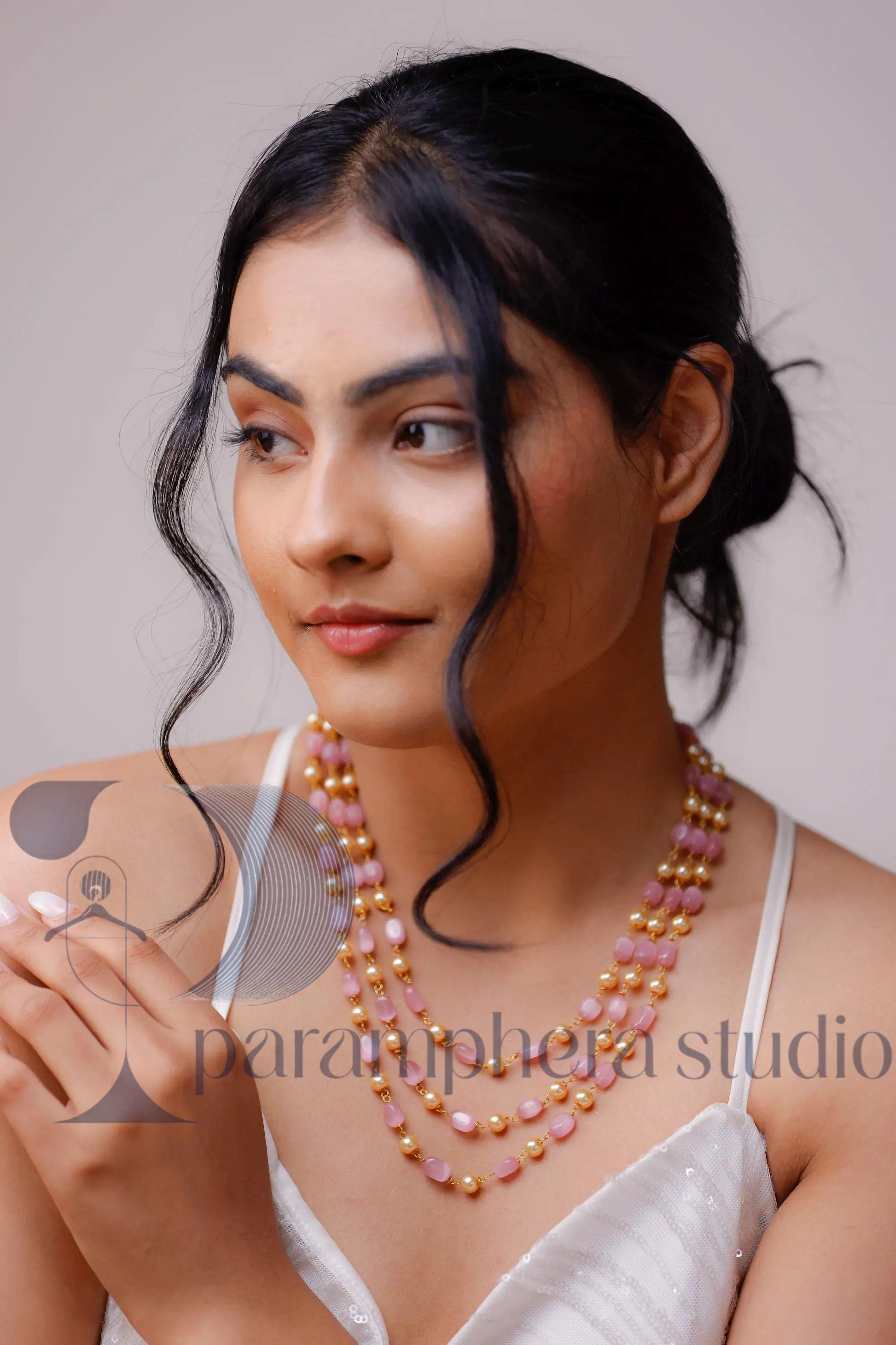 This pink and gold layered necklace is designed for women who love elegance with a soft, modern glow. Handcrafted with care, it features three graceful layers of blush pink glass beads paired with warm gold-toned pearls, creating a look that feels romantic, refined, and effortlessly luxurious. The layered silhouette adds beautiful depth without feeling heavy, making it a perfect choice for brides, celebrations, and elegant summer styling.